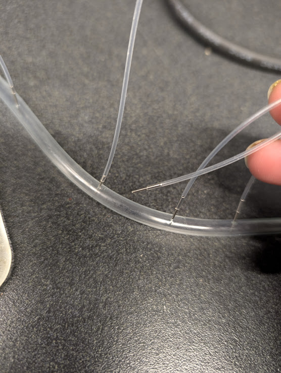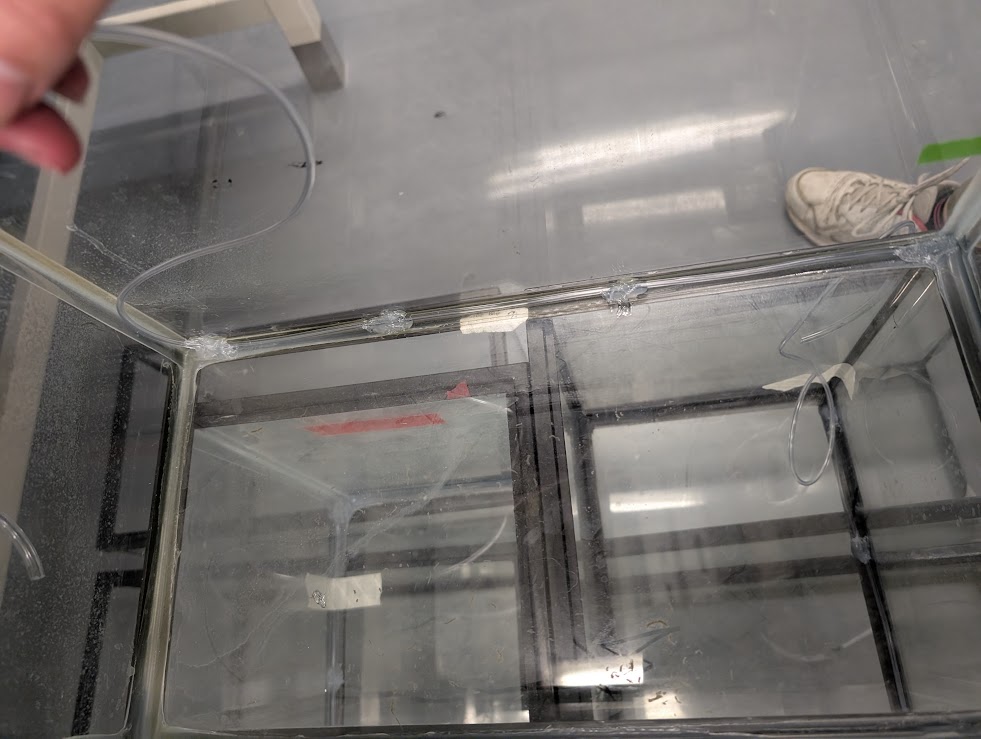 To address that, you can weigh down the polyethylene tubing using needles (point end into the main branch of airline, and non pointy section at the vessel-end of the small branch). Be mindful of your organism on this one – while the needle in the vessel is blunt, it can still cause some physical damage to soft-bodied or fragile organisms such as snails or betta fish.