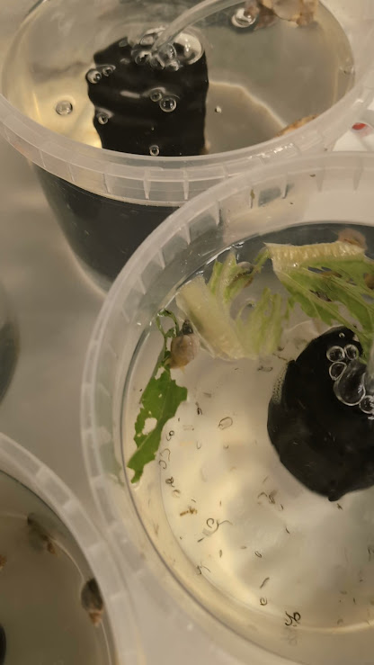 Sponge filters. These sponge filters (or corner filters with multiple layers) provide great aeration. They are weighted so will sink to the bottom of your vessel and stay there and provide good water movement in addition to aeration. The porous surface of the filter harbours nitrifying bacteria over time, so if you are wanting to sustain water quality over time, this may be a good option; however, if you are working with any contaminants, these filters tend to be a magnet for them and often skew the amount of contaminant in the water.