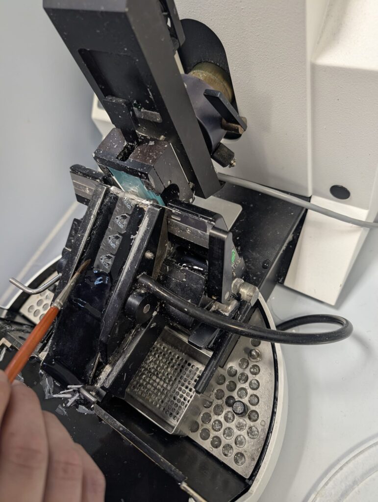 My research trip had an inherent efficiency requirement – big research goals in a short window of time when I could travel. The most influential tool in meeting my timeline was the automicrotome. Admittedly, this instrument brought on initial frustrations as it needed some repairs and maintenance; but once it was running, it was RUNNING.