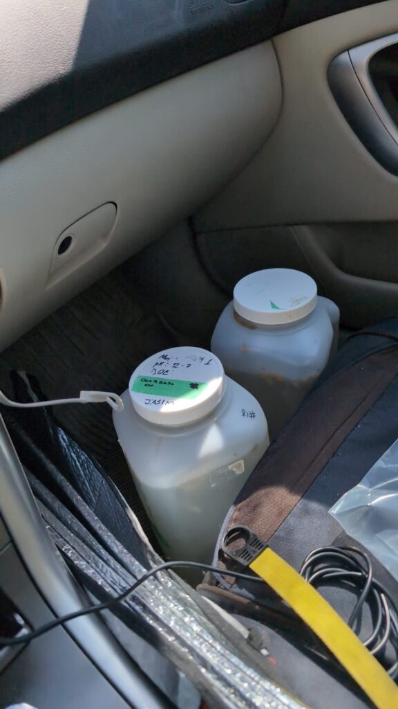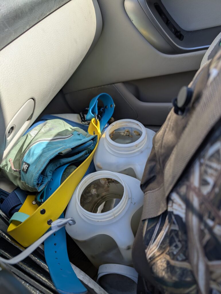 Snail water is generally not something you want spilling in your car (speaking from experience), so I was balancing aeration with spill risk. I ended up using other gear to wedge the jugs to minimize spilling as I wound around the mountains along my route. Next time we will be making airline-sized holes in the lids so that we can constantly aerate. I’ll also be bringing a proper T-valve so I do not need to constantly swap the airline between the jugs!